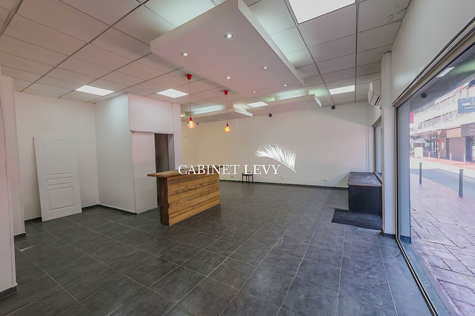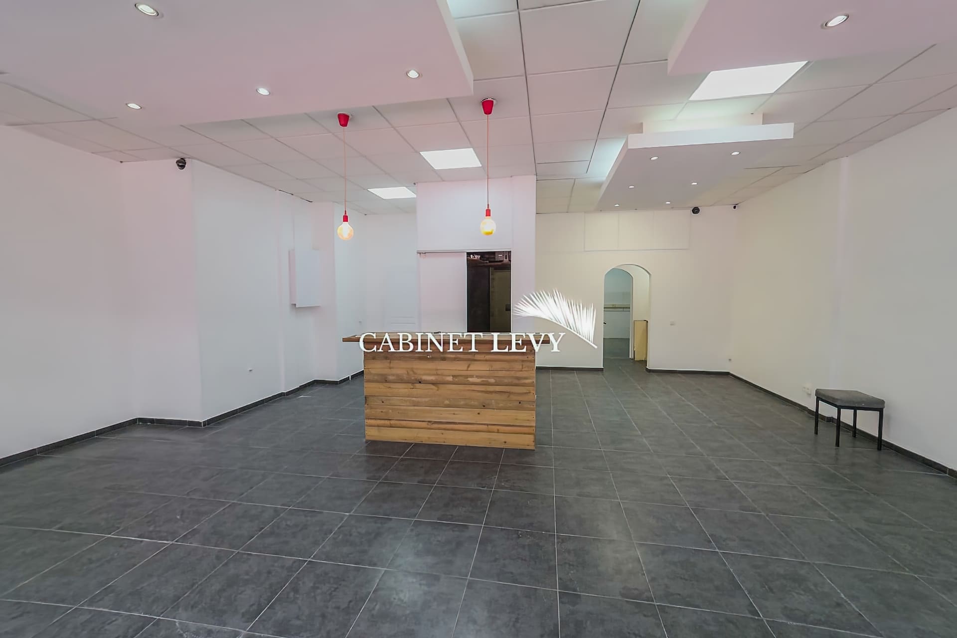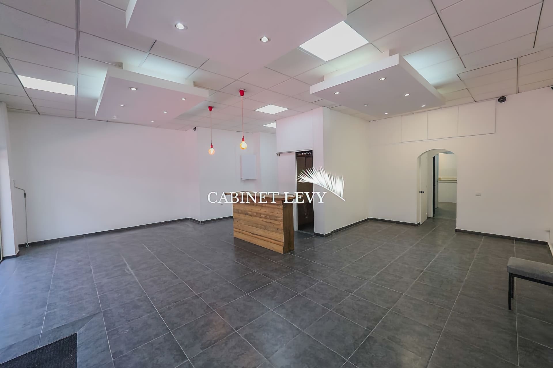 Intérieur récent : faux plafond avec éclairage LED, carrelage gris, climatisation, comptoir d'accueil bois, arche de passage