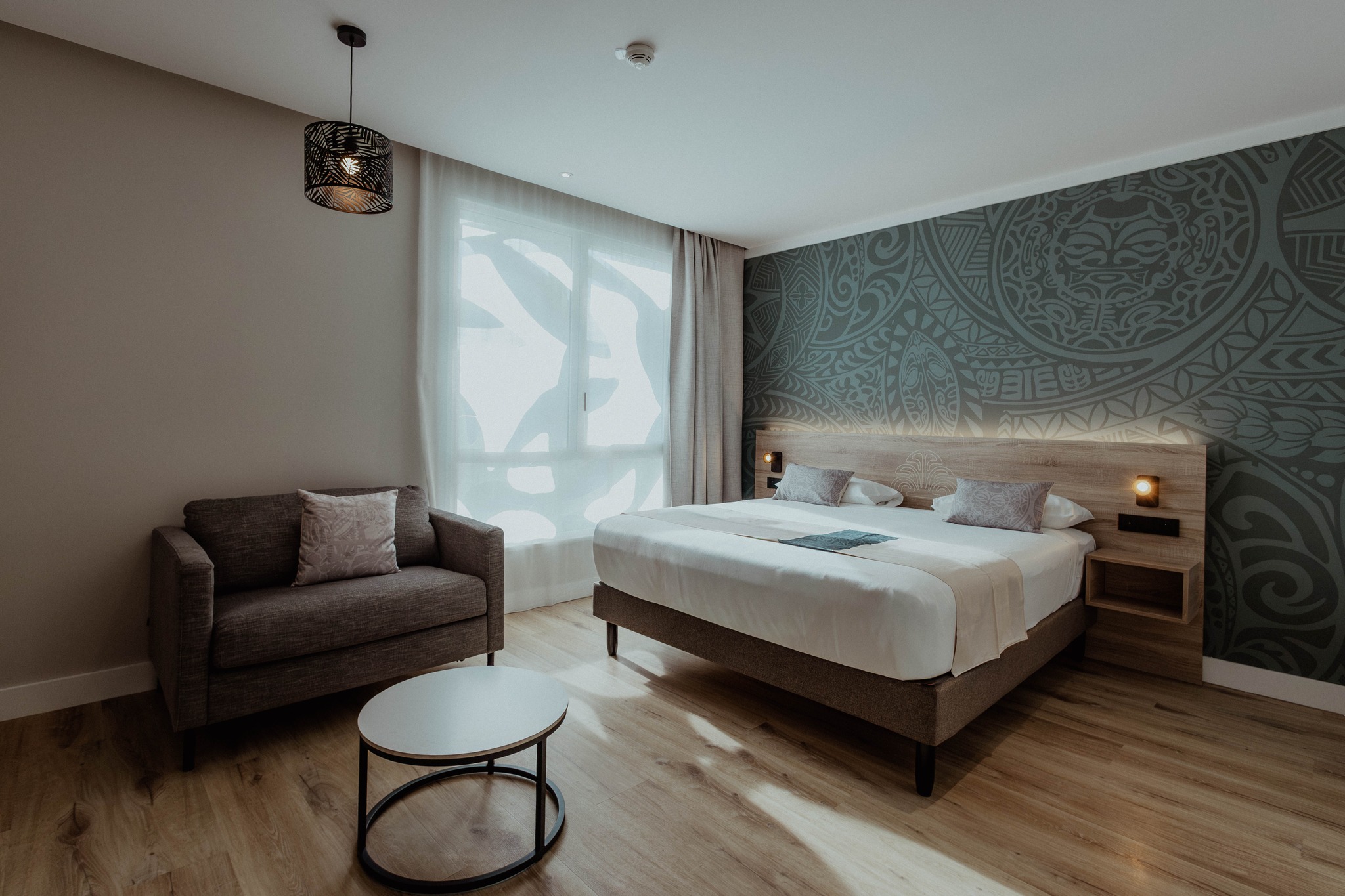 L’hôtel propose 43 chambres et appartements contemporains et confortables, décorés avec une touche polynésienne moderne. Il existe plusieurs catégories d’hébergements adaptées aussi bien aux séjours courts qu’aux séjours plus longs :