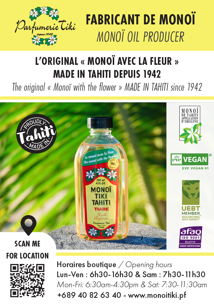 En plus de son célèbre Monoï Tiki (« Le Monoï avec la fleur »), TIKI TAHITI vous propose une gamme complète de produits de beauté 100% made in Tahiti et fabriqués à partir d'ingrédients naturels aux senteurs de Tahiti, Tahaa ou des Iles Marquises : savons, shampooings, gels douche, lotions corporelles, eaux de toilette, crèmes de corps, baumes de massage, exfoliants, crèmes solaire, huile de Tamanu ...