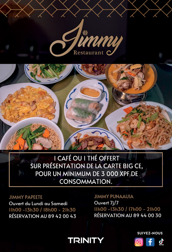 Le Restaurant Jimmy, situé dans le centre-ville de Papeete, offre un cadre dépaysant et convivial où les familles, les couples, les groupes d'amis et de collègues de travail peuvent se réunir autour d'un déjeuner ou d'un dîner savoureux.