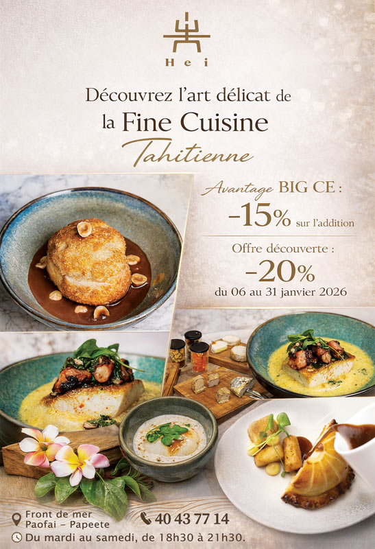 🍽️ Adresse gastronomique incontournable à Papeete, le Restaurant HEI vous accueille sur le Front de Mer de Paofai dans un cadre élégant et raffiné. Le chef y propose une cuisine bistronomique créative, inspirée des grands classiques de la gastronomie française et sublimée par des produits locaux de qualité.