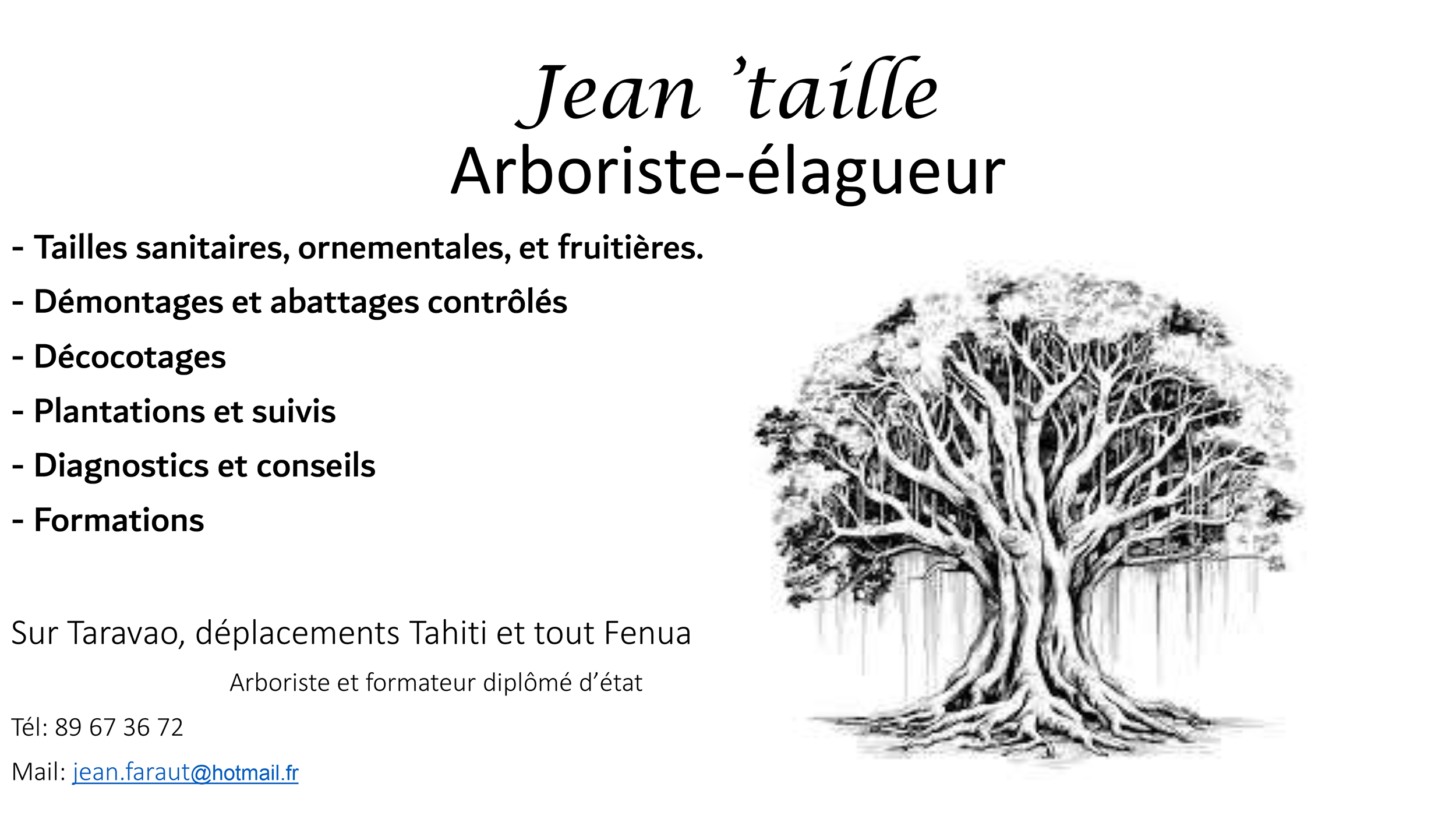 Passionné par la nature et la préservation de notre environnement, JEAN'TAILLE met son expertise à votre service pour prendre soin de vos arbres et espaces verts. Que ce soit pour l'élagage, l'abattage ou la formation, JEAN'TAILLE est là pour vous accompagner dans tous vos projets !