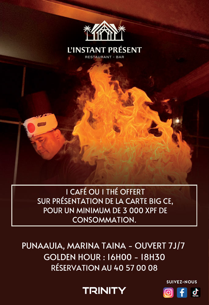 L’Instant Présent, un lieu privilégié et très agréable pour se restaurer, prendre un verre, situé dans le magnifique cadre de la Marina Taina à Punaauia face à Moorea, pour profiter de l’instant… l’Instant Présent